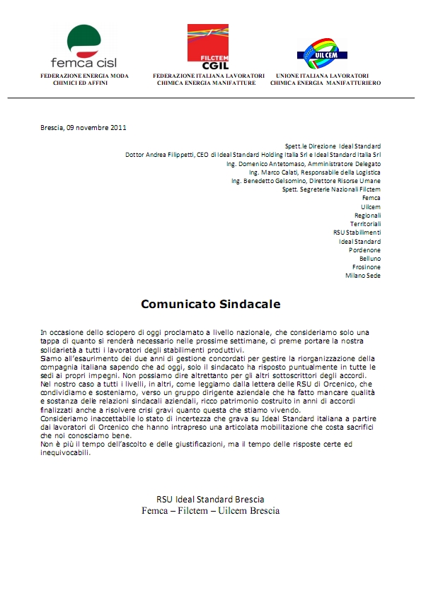 « 09/11/2011 MANIFESTAZIONE IDEAL STANDARD ORCENICO