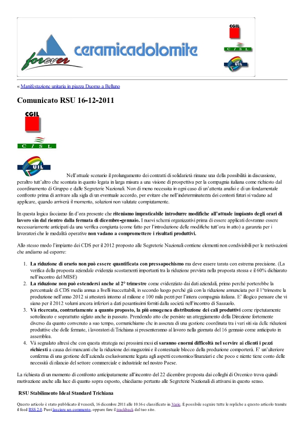 Condivido pienamente i contenuti del comunicato della RSU di Trichiana , in quanto rispecchiano in gran parte quello che già stato dichiarato in altri ambiti già da un anno a questa parte, considerato quindi tale allineamento, non ci resta che ben sperare per il prossimo futuro, condividendo la lotta per tutto il gruppo italiano! W I LAVORATORI IDEAL-STANDARD ED I LORO RAPPRESENTANTI