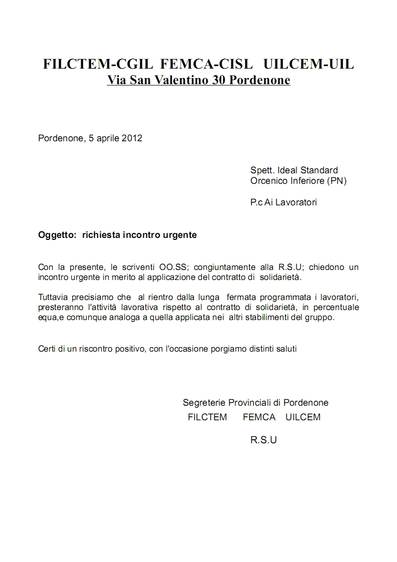 « COMUNICATO FILCTEM FEMCA UILCEM PORDENONE 05/04/2012
