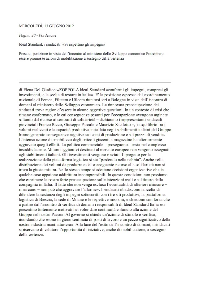 ''Normalmente le grandi società sono in grado di avere un rapporto misurato con il territorio in cui operano ma qui l'impressione e' stata differente, di modalità adottate ritenendo che questo fosse un Paese debole in cui si sarebbe potuto fare di tutto''. Cosi' il Presidente di Unindustria Pordenone, Michelangelo Agrusti, all'indomani della decisione assunta dalla Territoriale di Confindustria di non rappresentare più Ideal STandard in alcuna sede istituzionale, durante una conferenza stampa alla quale, questa mattina, hanno preso parte anche i vice presidenti Sergio Barel, Marco Camuccio, e Andrea Malacart. ''La comunità degli imprenditori di questa provincia ha altri codici - ha spiegato Agrusti - e sviluppato nel tempo una cultura di relazioni sindacali straordinaria. Intendiamoci: Unindustria assiste le aziende in difficoltà che sono in qualche modo giunte al capolinea ma e' chiaro, direi evidente, che nel momento in cui esistono concrete possibilità di ripresa o rilancio, noi alla morte scegliamo la vita. Preferiamo che le imprese che sono ancora in grado di farlo proseguano perché e' stato il manifatturiero a garantire la cifra industriale a questo territorio''. L'analitica ricostruzione della cronologia che ha ruotato attorno alla vicenda Ideal Standard e' già proiettata al futuro: ''Abbiamo chiesto e ottenuto una riunione al Mise per la prossima settimana - ha informato il Presidente - ragionevolmente mercoledì o giovedì, ci sono obbligazioni che in quella sede sono state assunte e che in quella sede debbono essere verificate. Certo - ha proseguito - trovo imbarazzante che a fronte dell'atteggiamento del Governo, che grazie anche all'interessamento della Regione aveva collocato IS in una short list di cassa in deroga sino a dicembre, eventualità davvero straordinaria che avrebbe garantito molte cose, sia stato raccolto un atteggiamento sprezzante non solo nei confronti di Pordenone e delle sue Istituzioni ma anche di quelle nazionali. Ognuno decide di vivere con l'eleganza che vuole, certo e' che qui discutiamo della vita di 450 persone''. Agrusti, ricordando l'atteggiamento estremamente responsabile delle organizzazioni sindacali, ha confermato che Unindustria, pur non rappresentando più IS, ''non si sottrarrà dall'obbligo civile di contribuire con tutti i soggetti rimasti in campo, affinché si individui una soluzione per il mantenimento dell'attività produttiva''.