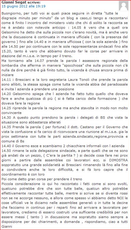 A nome di tutti coloro che apprezzano questo tipo di “diretta” ringraziamo per il servizio reso dal compagno Segat e ci auguriamo di arrivare, come auspicato il 14 giugno anche dall’amico Brancher, ad una collaborazione informativa senza cedere a tentazioni polemiche o insinuanti.