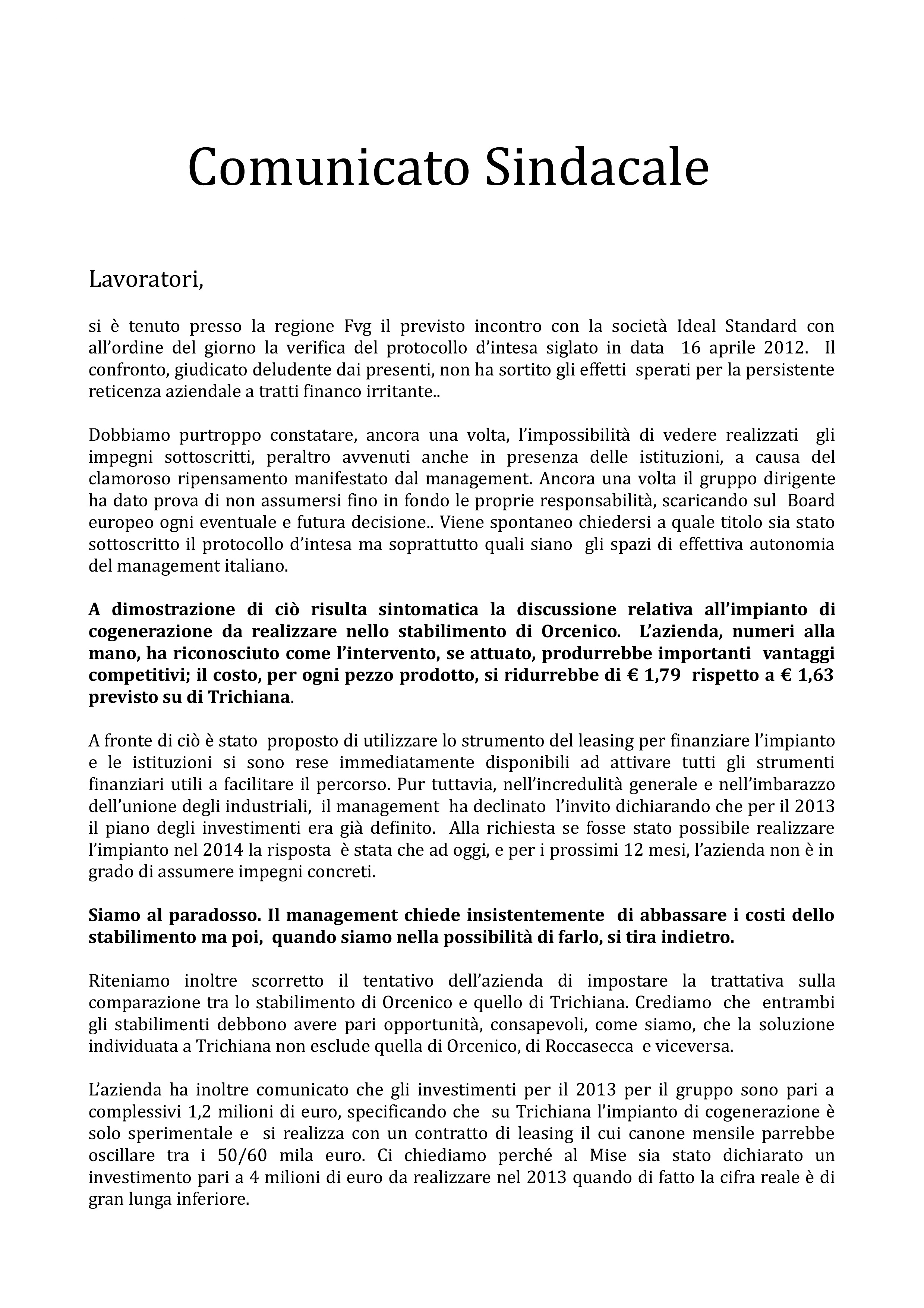 COMUNICATO UNITARIO