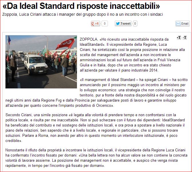 ''Normalmente le grandi società sono in grado di avere un rapporto misurato con il territorio in cui operano ma qui l'impressione e' stata differente, di modalità adottate ritenendo che questo fosse un Paese debole in cui si sarebbe potuto fare di tutto''. Cosi' il Presidente di Unindustria Pordenone, Michelangelo Agrusti, all'indomani della decisione assunta dalla Territoriale di Confindustria di non rappresentare più Ideal STandard in alcuna sede istituzionale, durante una conferenza stampa alla quale, questa mattina, hanno preso parte anche i vice presidenti Sergio Barel, Marco Camuccio, e Andrea Malacart. ''La comunità degli imprenditori di questa provincia ha altri codici - ha spiegato Agrusti - e sviluppato nel tempo una cultura di relazioni sindacali straordinaria. Intendiamoci: Unindustria assiste le aziende in difficoltà che sono in qualche modo giunte al capolinea ma e' chiaro, direi evidente, che nel momento in cui esistono concrete possibilità di ripresa o rilancio, noi alla morte scegliamo la vita. Preferiamo che le imprese che sono ancora in grado di farlo proseguano perché e' stato il manifatturiero a garantire la cifra industriale a questo territorio''. L'analitica ricostruzione della cronologia che ha ruotato attorno alla vicenda Ideal Standard e' già proiettata al futuro: ''Abbiamo chiesto e ottenuto una riunione al Mise per la prossima settimana - ha informato il Presidente - ragionevolmente mercoledì o giovedì, ci sono obbligazioni che in quella sede sono state assunte e che in quella sede debbono essere verificate. Certo - ha proseguito - trovo imbarazzante che a fronte dell'atteggiamento del Governo, che grazie anche all'interessamento della Regione aveva collocato IS in una short list di cassa in deroga sino a dicembre, eventualità davvero straordinaria che avrebbe garantito molte cose, sia stato raccolto un atteggiamento sprezzante non solo nei confronti di Pordenone e delle sue Istituzioni ma anche di quelle nazionali. Ognuno decide di vivere con l'eleganza che vuole, certo e' che qui discutiamo della vita di 450 persone''. Agrusti, ricordando l'atteggiamento estremamente responsabile delle organizzazioni sindacali, ha confermato che Unindustria, pur non rappresentando più IS, ''non si sottrarrà dall'obbligo civile di contribuire con tutti i soggetti rimasti in campo, affinché si individui una soluzione per il mantenimento dell'attività produttiva''.