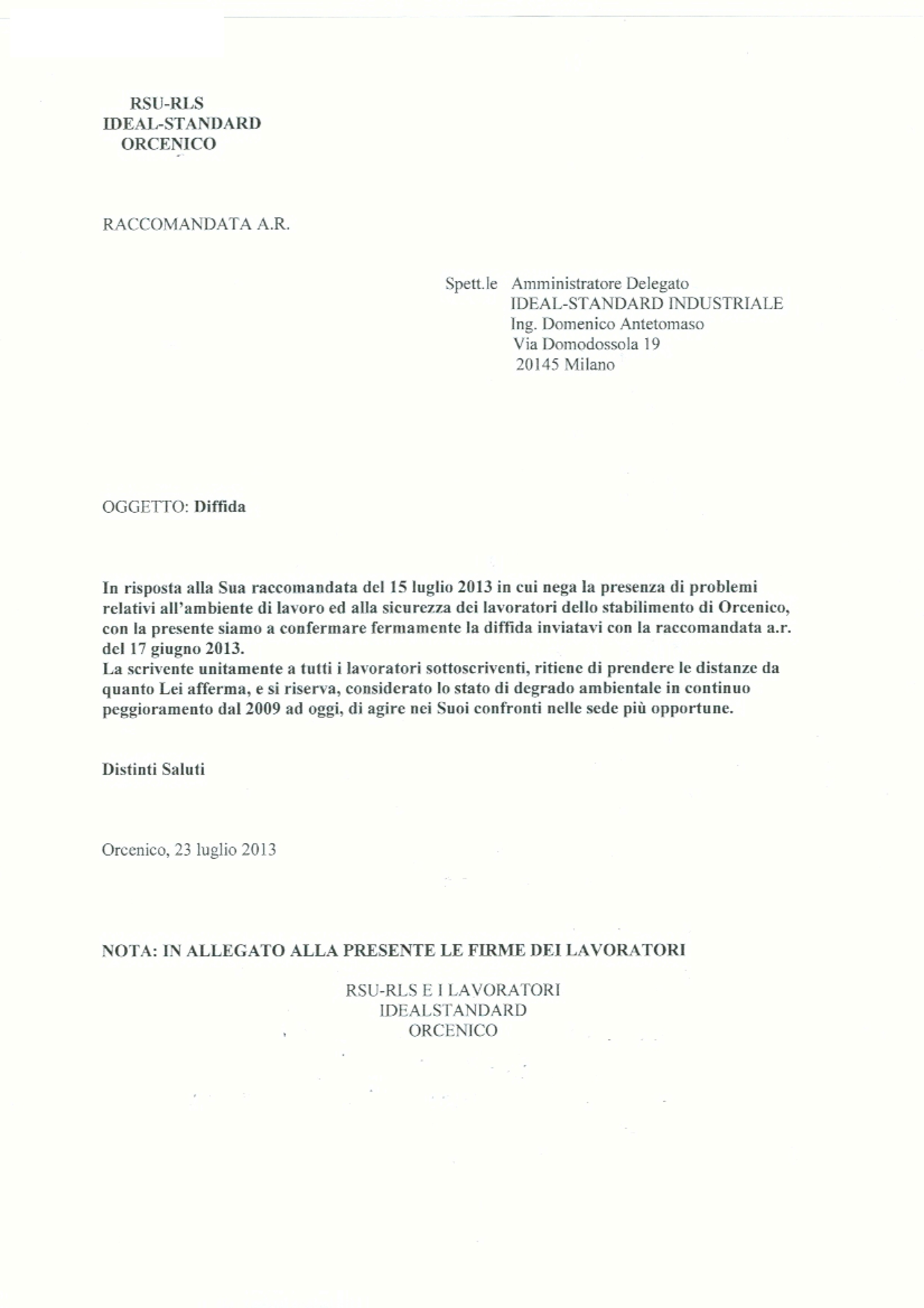 ALLA RACCOMANDATA QUI RIPRODOTTA SONO STATE ALLEGATE CIRCA 400 FIRMEdiffidarsu-001