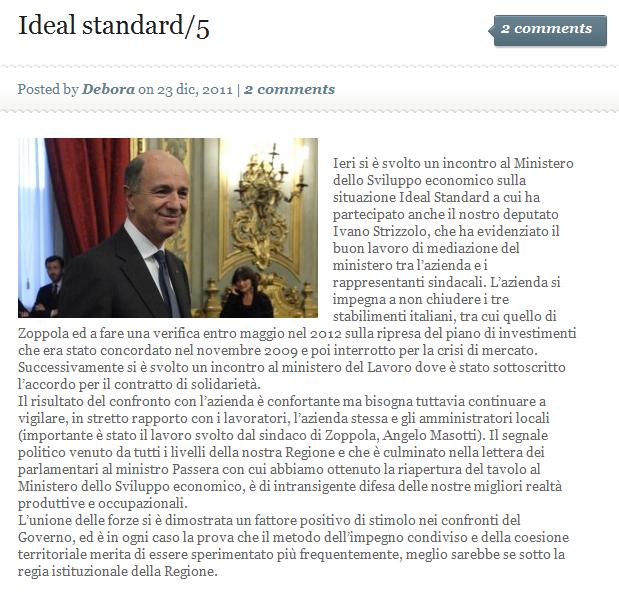 Un grazie, quindi, a tutti: ai Lavoratori, alle Istituzioni Politiche, alle Organizzazioni Sindacali e anche a chi, probabilmente, non piaceranno queste mie semplici considerazioni, ma che comunque a modo loro si sono adoperati per il futuro dell’Ideal Standard.