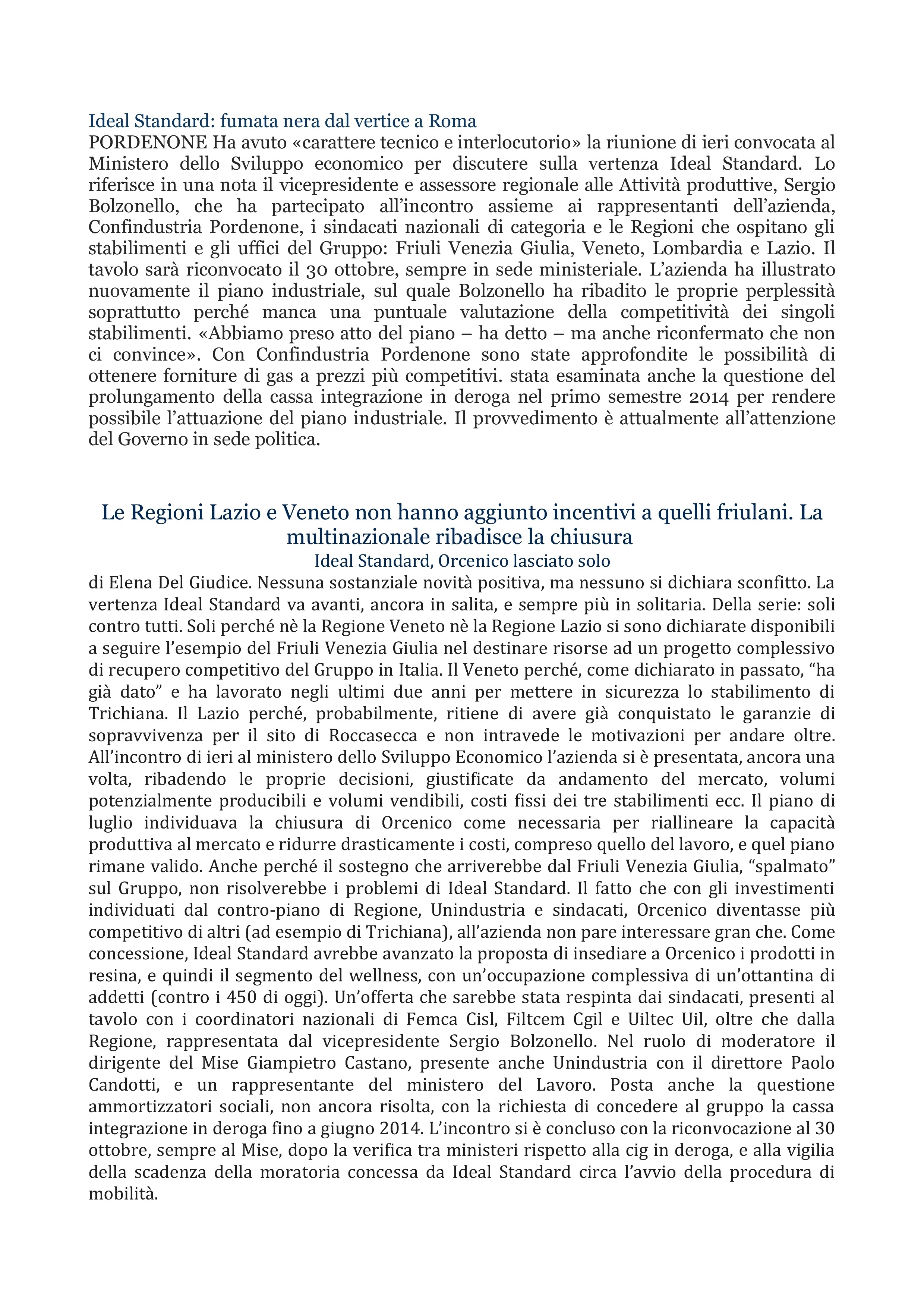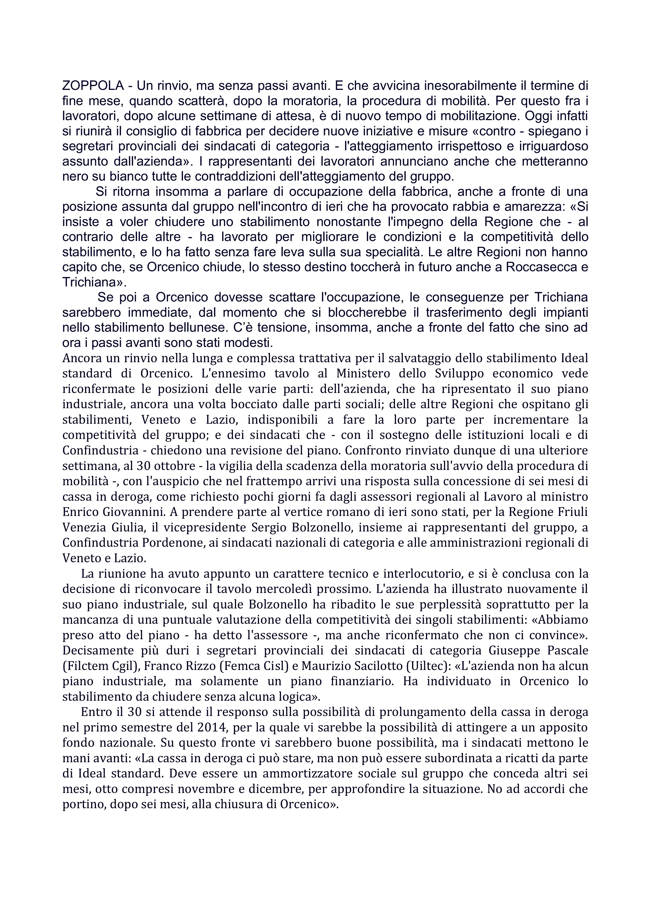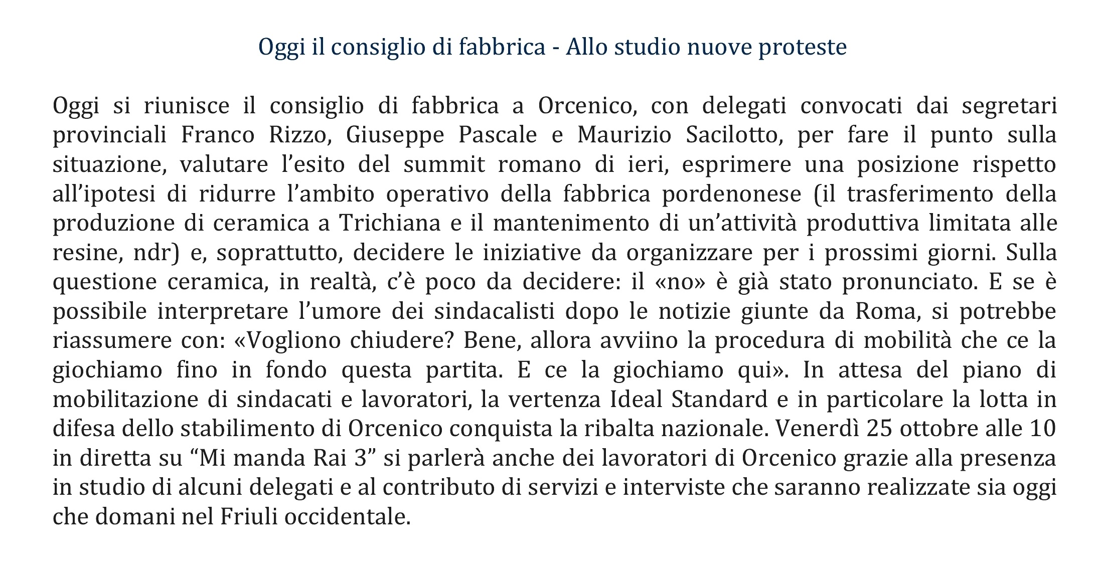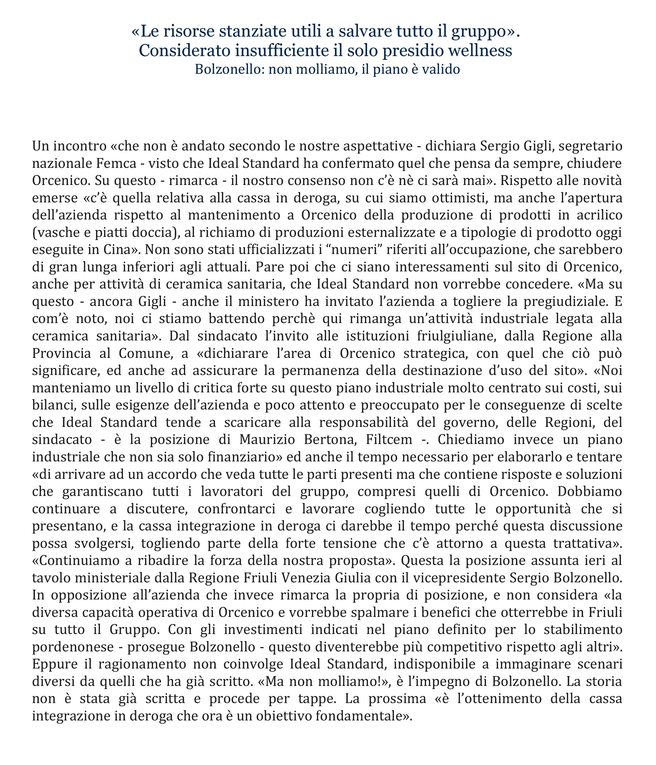 ''Normalmente le grandi società sono in grado di avere un rapporto misurato con il territorio in cui operano ma qui l'impressione e' stata differente, di modalità adottate ritenendo che questo fosse un Paese debole in cui si sarebbe potuto fare di tutto''. Cosi' il Presidente di Unindustria Pordenone, Michelangelo Agrusti, all'indomani della decisione assunta dalla Territoriale di Confindustria di non rappresentare più Ideal STandard in alcuna sede istituzionale, durante una conferenza stampa alla quale, questa mattina, hanno preso parte anche i vice presidenti Sergio Barel, Marco Camuccio, e Andrea Malacart. ''La comunità degli imprenditori di questa provincia ha altri codici - ha spiegato Agrusti - e sviluppato nel tempo una cultura di relazioni sindacali straordinaria. Intendiamoci: Unindustria assiste le aziende in difficoltà che sono in qualche modo giunte al capolinea ma e' chiaro, direi evidente, che nel momento in cui esistono concrete possibilità di ripresa o rilancio, noi alla morte scegliamo la vita. Preferiamo che le imprese che sono ancora in grado di farlo proseguano perché e' stato il manifatturiero a garantire la cifra industriale a questo territorio''. L'analitica ricostruzione della cronologia che ha ruotato attorno alla vicenda Ideal Standard e' già proiettata al futuro: ''Abbiamo chiesto e ottenuto una riunione al Mise per la prossima settimana - ha informato il Presidente - ragionevolmente mercoledì o giovedì, ci sono obbligazioni che in quella sede sono state assunte e che in quella sede debbono essere verificate. Certo - ha proseguito - trovo imbarazzante che a fronte dell'atteggiamento del Governo, che grazie anche all'interessamento della Regione aveva collocato IS in una short list di cassa in deroga sino a dicembre, eventualità davvero straordinaria che avrebbe garantito molte cose, sia stato raccolto un atteggiamento sprezzante non solo nei confronti di Pordenone e delle sue Istituzioni ma anche di quelle nazionali. Ognuno decide di vivere con l'eleganza che vuole, certo e' che qui discutiamo della vita di 450 persone''. Agrusti, ricordando l'atteggiamento estremamente responsabile delle organizzazioni sindacali, ha confermato che Unindustria, pur non rappresentando più IS, ''non si sottrarrà dall'obbligo civile di contribuire con tutti i soggetti rimasti in campo, affinché si individui una soluzione per il mantenimento dell'attività produttiva''.