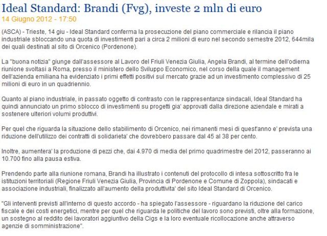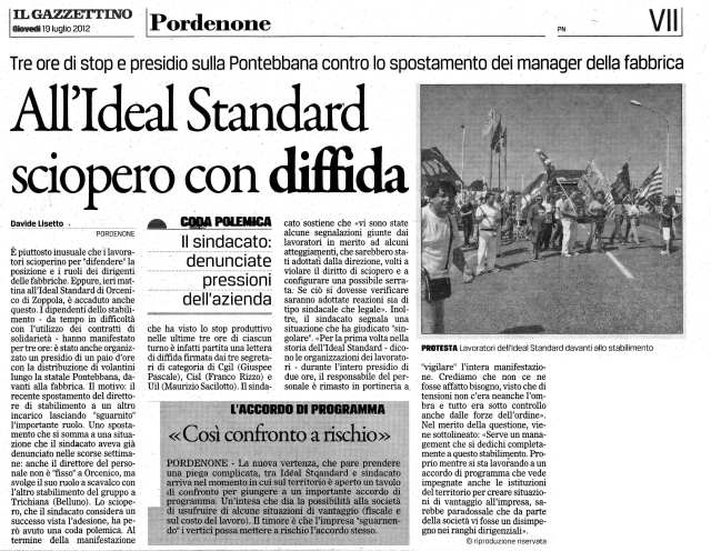 ''Normalmente le grandi società sono in grado di avere un rapporto misurato con il territorio in cui operano ma qui l'impressione e' stata differente, di modalità adottate ritenendo che questo fosse un Paese debole in cui si sarebbe potuto fare di tutto''. Cosi' il Presidente di Unindustria Pordenone, Michelangelo Agrusti, all'indomani della decisione assunta dalla Territoriale di Confindustria di non rappresentare più Ideal STandard in alcuna sede istituzionale, durante una conferenza stampa alla quale, questa mattina, hanno preso parte anche i vice presidenti Sergio Barel, Marco Camuccio, e Andrea Malacart. ''La comunità degli imprenditori di questa provincia ha altri codici - ha spiegato Agrusti - e sviluppato nel tempo una cultura di relazioni sindacali straordinaria. Intendiamoci: Unindustria assiste le aziende in difficoltà che sono in qualche modo giunte al capolinea ma e' chiaro, direi evidente, che nel momento in cui esistono concrete possibilità di ripresa o rilancio, noi alla morte scegliamo la vita. Preferiamo che le imprese che sono ancora in grado di farlo proseguano perché e' stato il manifatturiero a garantire la cifra industriale a questo territorio''. L'analitica ricostruzione della cronologia che ha ruotato attorno alla vicenda Ideal Standard e' già proiettata al futuro: ''Abbiamo chiesto e ottenuto una riunione al Mise per la prossima settimana - ha informato il Presidente - ragionevolmente mercoledì o giovedì, ci sono obbligazioni che in quella sede sono state assunte e che in quella sede debbono essere verificate. Certo - ha proseguito - trovo imbarazzante che a fronte dell'atteggiamento del Governo, che grazie anche all'interessamento della Regione aveva collocato IS in una short list di cassa in deroga sino a dicembre, eventualità davvero straordinaria che avrebbe garantito molte cose, sia stato raccolto un atteggiamento sprezzante non solo nei confronti di Pordenone e delle sue Istituzioni ma anche di quelle nazionali. Ognuno decide di vivere con l'eleganza che vuole, certo e' che qui discutiamo della vita di 450 persone''. Agrusti, ricordando l'atteggiamento estremamente responsabile delle organizzazioni sindacali, ha confermato che Unindustria, pur non rappresentando più IS, ''non si sottrarrà dall'obbligo civile di contribuire con tutti i soggetti rimasti in campo, affinché si individui una soluzione per il mantenimento dell'attività produttiva''.