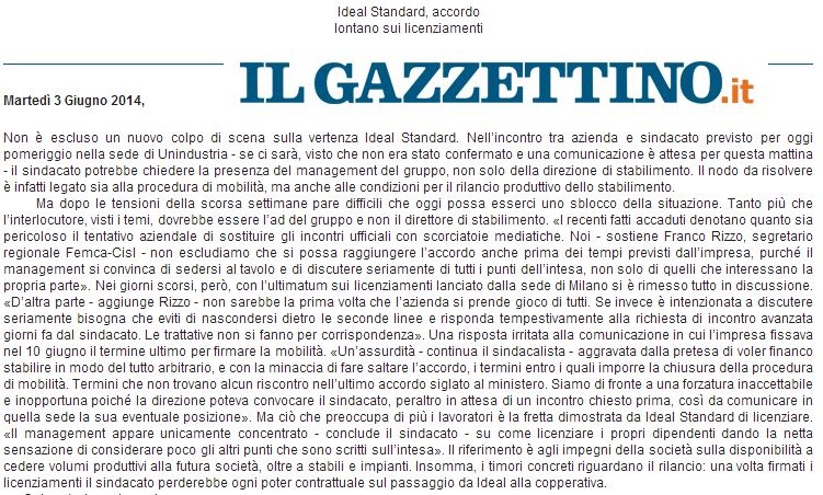 lavoratori e ci fanno giungere minacce di licenziamento e di azioni unilaterali. La discussione deve avvenire dentro un quadro di reciproche certezze. Certezze che noi abbiamo dato all’impresa, ma che ora il management mette in discussione in modo irresponsabile. Ci pare che l’obiettivo recondito sia solo quello di fare saltare l’accordo. Ma faremo capire all’impresa che ha una responsabilità sociale e che non se ne andrà dal territorio lasciando un dramma sociale». Se non ci saranno svolte il rischio vero è che salti l’operazione di rilancio attraverso la cooperativa. Il sindacato, se partiranno i licenziamenti, è pronto a impugnarli davanti al giudice. Un “prezzo” che a Ideal Standard costerebbe molto caro.