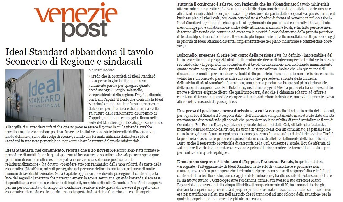 ''Normalmente le grandi società sono in grado di avere un rapporto misurato con il territorio in cui operano ma qui l'impressione e' stata differente, di modalità adottate ritenendo che questo fosse un Paese debole in cui si sarebbe potuto fare di tutto''. Cosi' il Presidente di Unindustria Pordenone, Michelangelo Agrusti, all'indomani della decisione assunta dalla Territoriale di Confindustria di non rappresentare più Ideal STandard in alcuna sede istituzionale, durante una conferenza stampa alla quale, questa mattina, hanno preso parte anche i vice presidenti Sergio Barel, Marco Camuccio, e Andrea Malacart. ''La comunità degli imprenditori di questa provincia ha altri codici - ha spiegato Agrusti - e sviluppato nel tempo una cultura di relazioni sindacali straordinaria. Intendiamoci: Unindustria assiste le aziende in difficoltà che sono in qualche modo giunte al capolinea ma e' chiaro, direi evidente, che nel momento in cui esistono concrete possibilità di ripresa o rilancio, noi alla morte scegliamo la vita. Preferiamo che le imprese che sono ancora in grado di farlo proseguano perché e' stato il manifatturiero a garantire la cifra industriale a questo territorio''. L'analitica ricostruzione della cronologia che ha ruotato attorno alla vicenda Ideal Standard e' già proiettata al futuro: ''Abbiamo chiesto e ottenuto una riunione al Mise per la prossima settimana - ha informato il Presidente - ragionevolmente mercoledì o giovedì, ci sono obbligazioni che in quella sede sono state assunte e che in quella sede debbono essere verificate. Certo - ha proseguito - trovo imbarazzante che a fronte dell'atteggiamento del Governo, che grazie anche all'interessamento della Regione aveva collocato IS in una short list di cassa in deroga sino a dicembre, eventualità davvero straordinaria che avrebbe garantito molte cose, sia stato raccolto un atteggiamento sprezzante non solo nei confronti di Pordenone e delle sue Istituzioni ma anche di quelle nazionali. Ognuno decide di vivere con l'eleganza che vuole, certo e' che qui discutiamo della vita di 450 persone''. Agrusti, ricordando l'atteggiamento estremamente responsabile delle organizzazioni sindacali, ha confermato che Unindustria, pur non rappresentando più IS, ''non si sottrarrà dall'obbligo civile di contribuire con tutti i soggetti rimasti in campo, affinché si individui una soluzione per il mantenimento dell'attività produttiva''.
