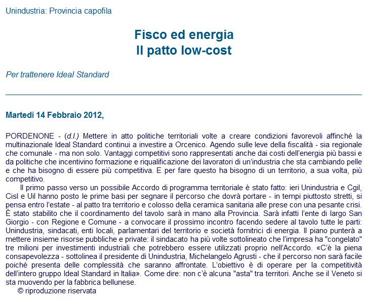 ''Normalmente le grandi società sono in grado di avere un rapporto misurato con il territorio in cui operano ma qui l'impressione e' stata differente, di modalità adottate ritenendo che questo fosse un Paese debole in cui si sarebbe potuto fare di tutto''. Cosi' il Presidente di Unindustria Pordenone, Michelangelo Agrusti, all'indomani della decisione assunta dalla Territoriale di Confindustria di non rappresentare più Ideal STandard in alcuna sede istituzionale, durante una conferenza stampa alla quale, questa mattina, hanno preso parte anche i vice presidenti Sergio Barel, Marco Camuccio, e Andrea Malacart. ''La comunità degli imprenditori di questa provincia ha altri codici - ha spiegato Agrusti - e sviluppato nel tempo una cultura di relazioni sindacali straordinaria. Intendiamoci: Unindustria assiste le aziende in difficoltà che sono in qualche modo giunte al capolinea ma e' chiaro, direi evidente, che nel momento in cui esistono concrete possibilità di ripresa o rilancio, noi alla morte scegliamo la vita. Preferiamo che le imprese che sono ancora in grado di farlo proseguano perché e' stato il manifatturiero a garantire la cifra industriale a questo territorio''. L'analitica ricostruzione della cronologia che ha ruotato attorno alla vicenda Ideal Standard e' già proiettata al futuro: ''Abbiamo chiesto e ottenuto una riunione al Mise per la prossima settimana - ha informato il Presidente - ragionevolmente mercoledì o giovedì, ci sono obbligazioni che in quella sede sono state assunte e che in quella sede debbono essere verificate. Certo - ha proseguito - trovo imbarazzante che a fronte dell'atteggiamento del Governo, che grazie anche all'interessamento della Regione aveva collocato IS in una short list di cassa in deroga sino a dicembre, eventualità davvero straordinaria che avrebbe garantito molte cose, sia stato raccolto un atteggiamento sprezzante non solo nei confronti di Pordenone e delle sue Istituzioni ma anche di quelle nazionali. Ognuno decide di vivere con l'eleganza che vuole, certo e' che qui discutiamo della vita di 450 persone''. Agrusti, ricordando l'atteggiamento estremamente responsabile delle organizzazioni sindacali, ha confermato che Unindustria, pur non rappresentando più IS, ''non si sottrarrà dall'obbligo civile di contribuire con tutti i soggetti rimasti in campo, affinché si individui una soluzione per il mantenimento dell'attività produttiva''.